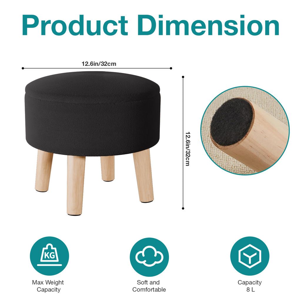 Small Size & Easy Assemble: Small round storage ottoman size is 12.6''W x 12.6''D x 12.6''H. Taking out all accessories from storage space, Install legs with 5 minutes. After Assemble it, it can be a small space for you.