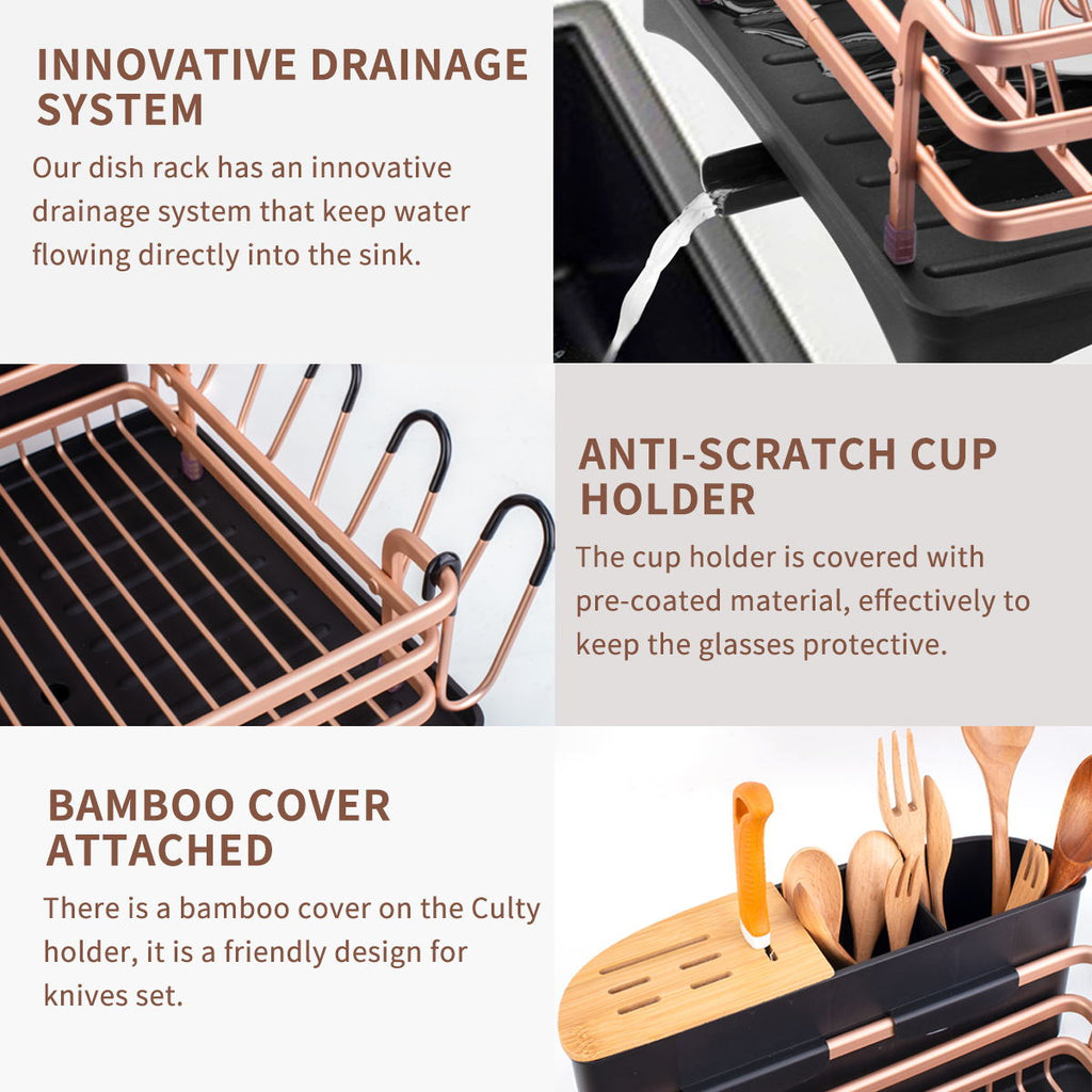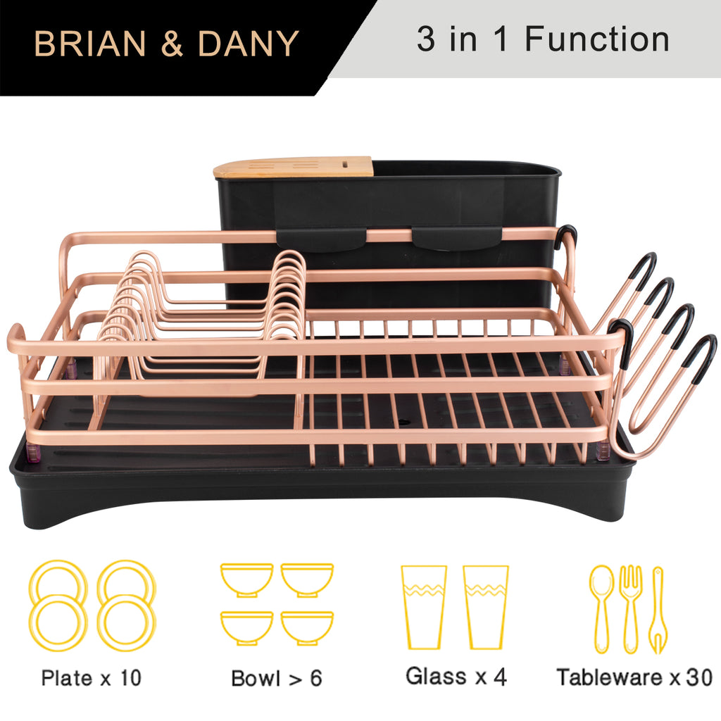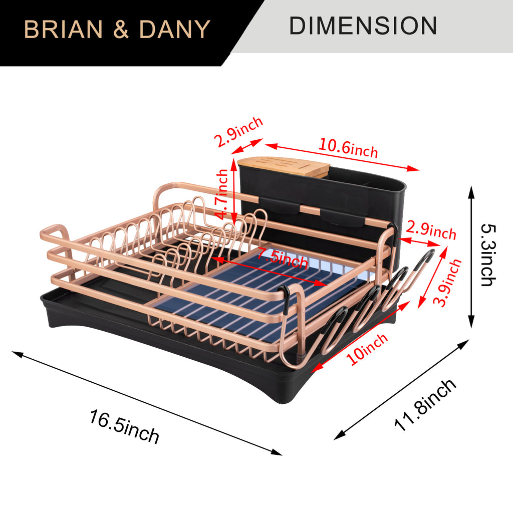 BRIAN & DANY Aluminum Dish Drying Rack,Never Rust Dish Rack with Removable Cutlery Holder &Cup Holder,Unique 360° Swivel Spout Drain Board,Gold